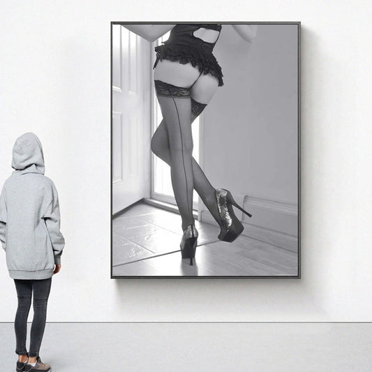 Indulge in the allure of a seductive woman draped in black lingerie on canvass