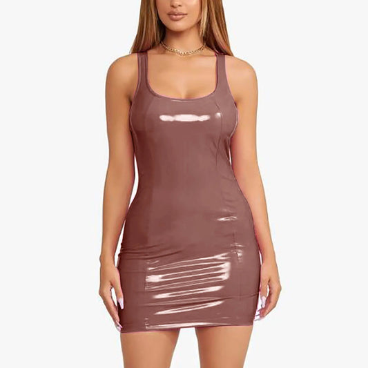 Prova il massimo dello stile e della sicurezza con il nostro mini abito senza maniche in finto lattice.